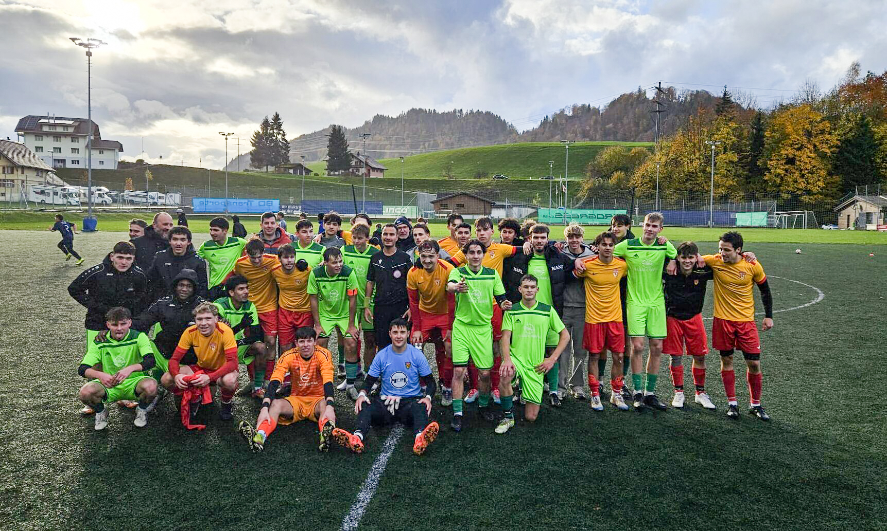 Das gemeinsame Foto zeigt eindrücklich, dass sportlicher Erfolg und Fairness Hand in Hand gehen – und die Freude über den Aufstieg auf beiden Seiten riesig ist.