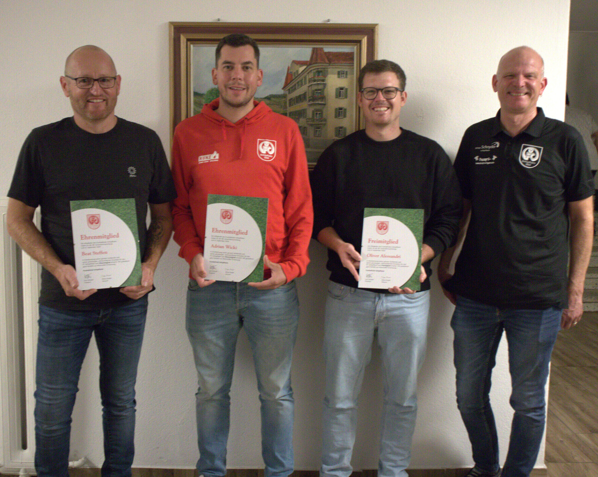 Ein Hö­he­punkt der 90. Ge­ne­ral­ver­samm­lung am 6. Sep­tem­ber 2024 des FC Schüpf­heim wa­ren die Eh­run­gen lang­jäh­ri­ger und ver­dien­ter Mit­glie­der. Zwei be­son­de­re Per­sön­lich­kei­ten wur­den für ihr un­er­müd­li­ches En­ga­ge­ment aus­ge­zeich­net und zu Eh­ren­mit­glie­dern er­nannt: Beat Stef­fen und Adri­an Wi­cki.